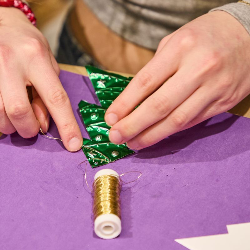 Wie schön das glänzt und funkelt! In unserem Dezember-Drop-In-Drop-Out wird es natürlich weihnachtlich. Stell Deinen Weihnachtsbaum auf oder einen Zweig mit Beeren in die Vase und gestalte dafür im DIDO einen weihnachtlichen Anhänger aus Prägefolie. Zur Verfügung stehen Dir verschiedene Farben Prägefolie, verschiedene Vorlagen (Du kannst aber natürlich auch eine eigene Form entwerfen) und die passenden Werkzeuge, um Deinen Anhänger mit einem individuellen Prägemotiv zu versehen.